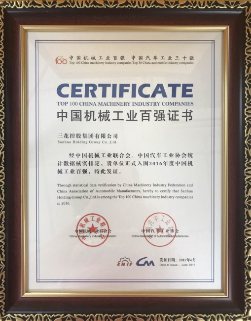 Sanhua Holding Group ranks?twentieth of?top 100 machinery industry enterprises.